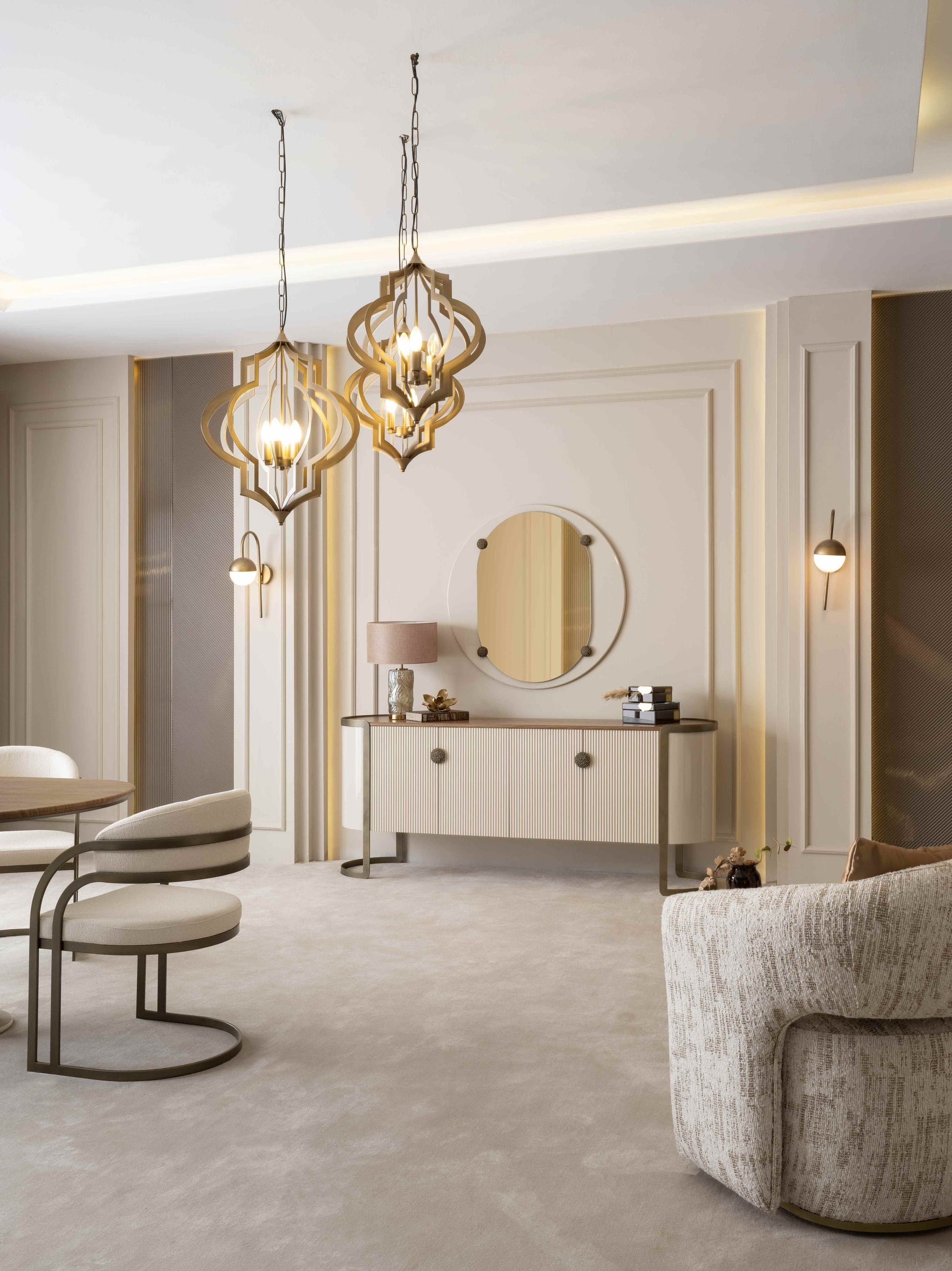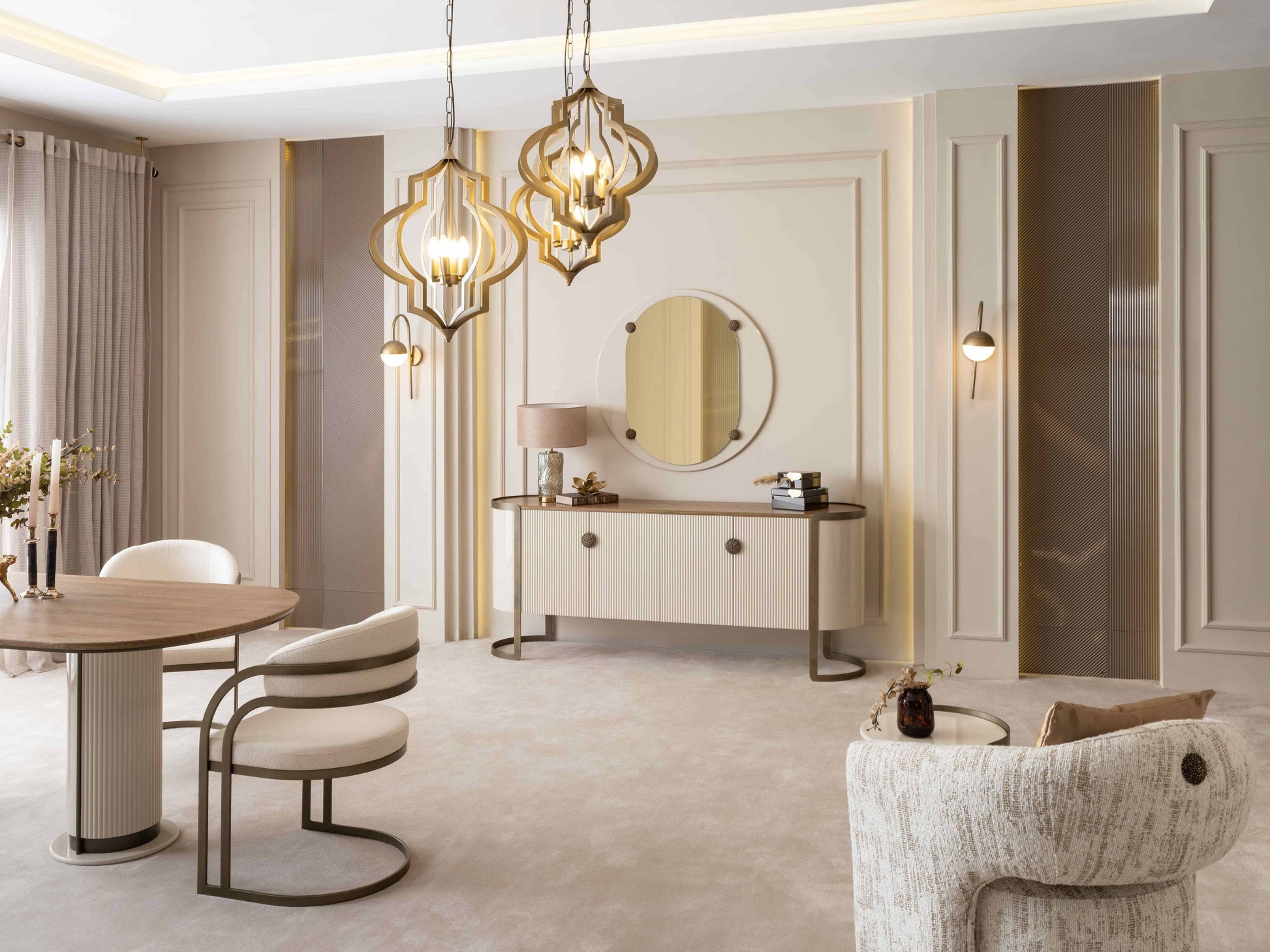The Mocha Dining Set delivers a complete interior solution with nine coordinated pieces: dining table, dining chairs, sideboard, console table, TV unit, coffee table, nesting tables, side table, and mirror. Each element is thoughtfully proportioned to work in harmony, eliminating the guesswork of mixing finishes and styles. A matching sofa collection extends the aesthetic throughout your home, enabling you to establish a refined, unified design narrative across living and dining zones. Perfect for discerning customers who value coherence and editorial sophistication in their furnishing choices.